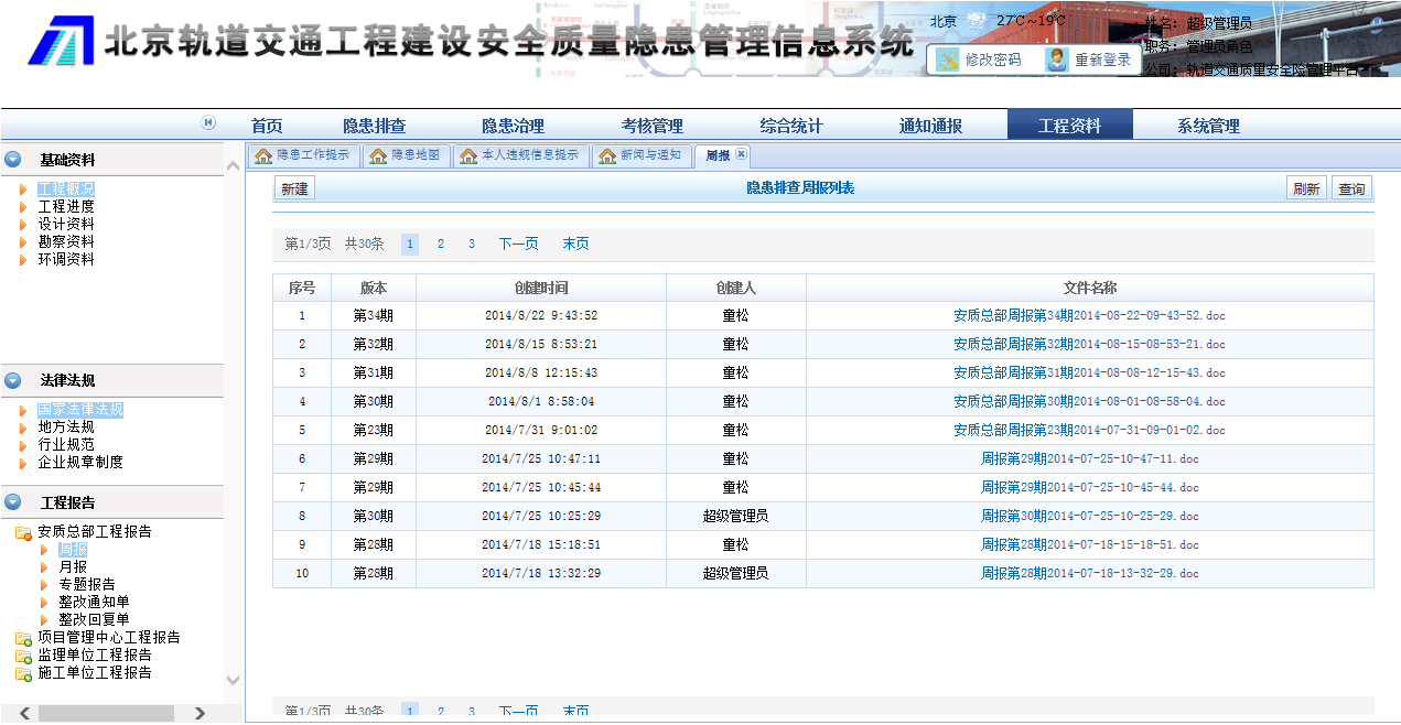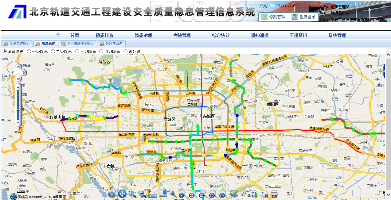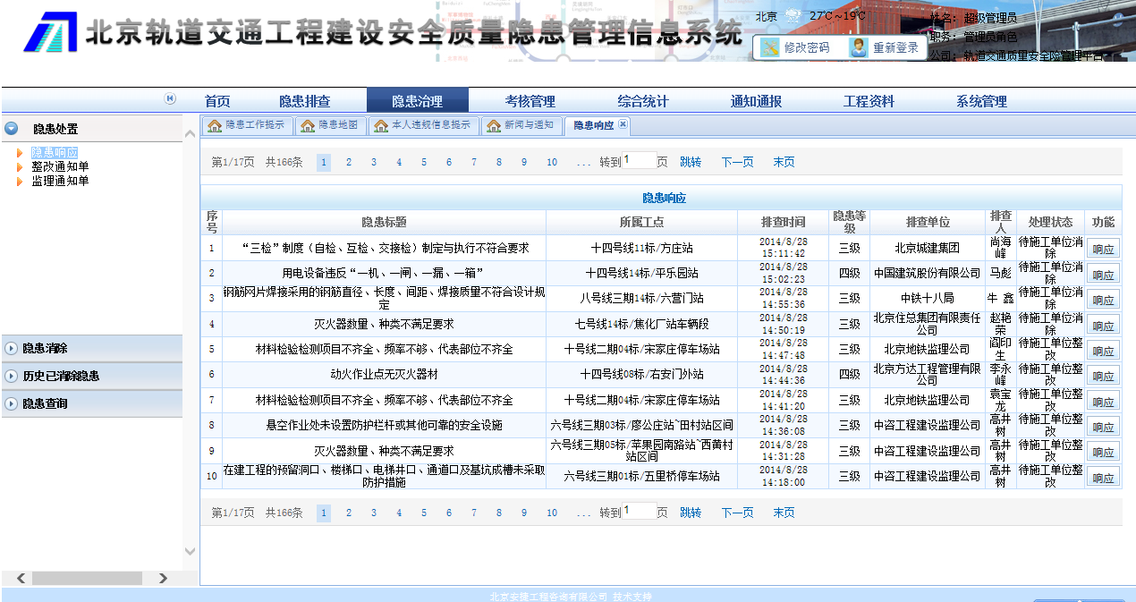 該系統(tǒng)包括隱患工作提示、隱患排查、隱患治理、考核管理、綜合統(tǒng)計(jì)、考核評(píng)分、工程報(bào)告、通知通報(bào)等功能,事先對(duì)城市軌道交通工程建設(shè)安全質(zhì)量隱患的有序管理,實(shí)現(xiàn)參建各方隱患排查與治理的協(xié)同工作,從而將事故控制在萌芽狀態(tài)。
