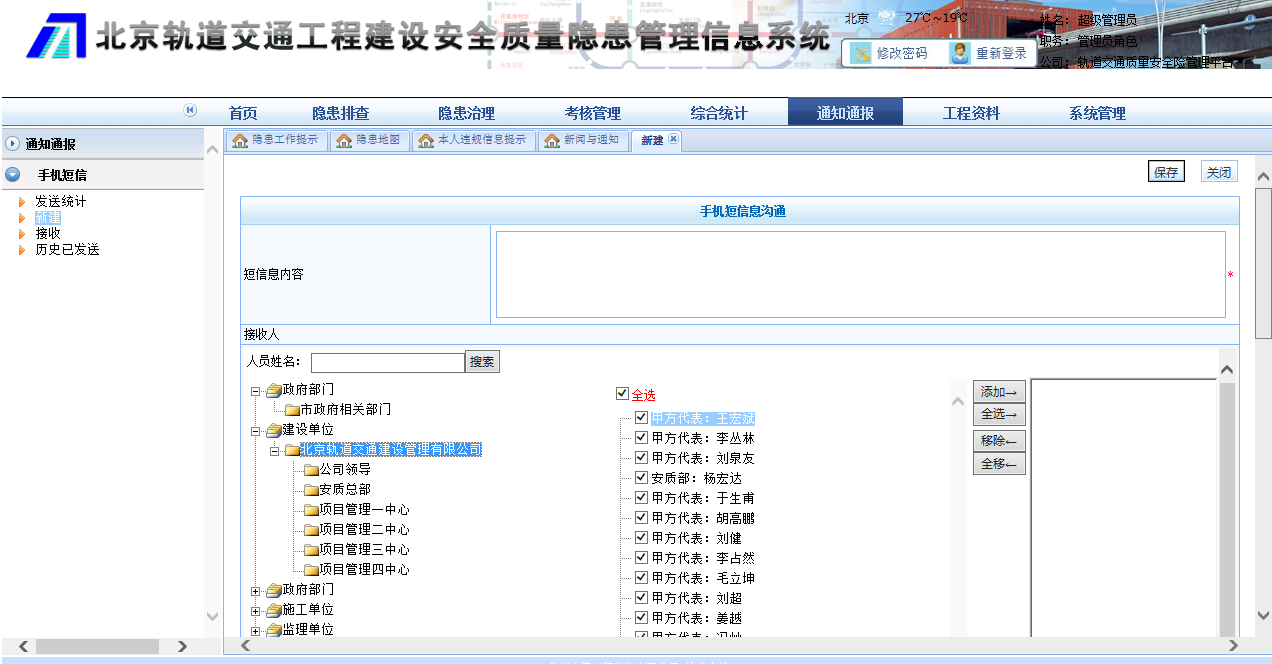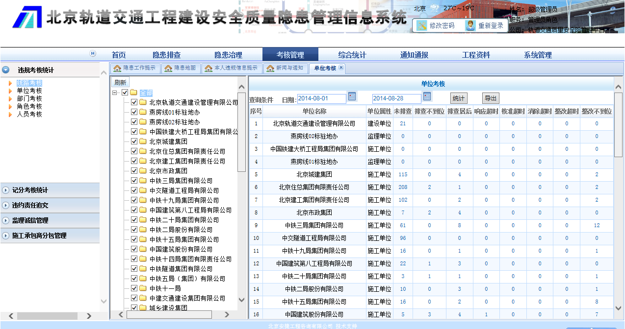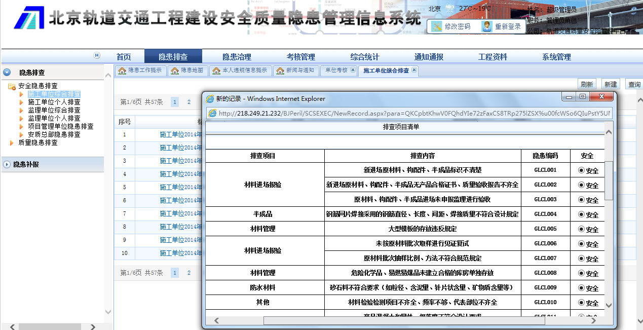 北京軌道交通工程建設(shè)安全質(zhì)量隱患管理系統(tǒng)是以北京城市軌道交通工程各建設(shè)階段的安全質(zhì)量隱患為管控對(duì)象,內(nèi)置相關(guān)法律、法規(guī)、技術(shù)標(biāo)準(zhǔn)、規(guī)范等條文明確規(guī)定的安全質(zhì)量排查要點(diǎn),引導(dǎo)與提示各參建單位按照各自職責(zé)開展隱患排查治理工作;系統(tǒng)理清了參見各方隱患管理職責(zé),建立了隱患排查與治理體系,實(shí)現(xiàn)了隱患的閉環(huán)管理;系統(tǒng)建立提示信息主動(dòng)推送機(jī)制,施工、監(jiān)理及建設(shè)單位需要開張的隱患排查頻次要求、隱患治理信息、違約信息,通過系統(tǒng)首頁(yè)或者短信消息實(shí)現(xiàn)主動(dòng)推送;能夠?qū)崿F(xiàn)對(duì)參見各方的工作情況和效果逐級(jí)考核評(píng)分,違約責(zé)任追究;系統(tǒng)有強(qiáng)大的統(tǒng)計(jì)分析與報(bào)表生成功能;建立移動(dòng)巡檢平臺(tái),能通過手機(jī)等智能設(shè)備開展隱患排查與治理工作;成熟的權(quán)限管理功能對(duì)功能權(quán)限與數(shù)據(jù)權(quán)限分層管理,嚴(yán)格控制參建單位、不同角色、不同用戶的權(quán)限。