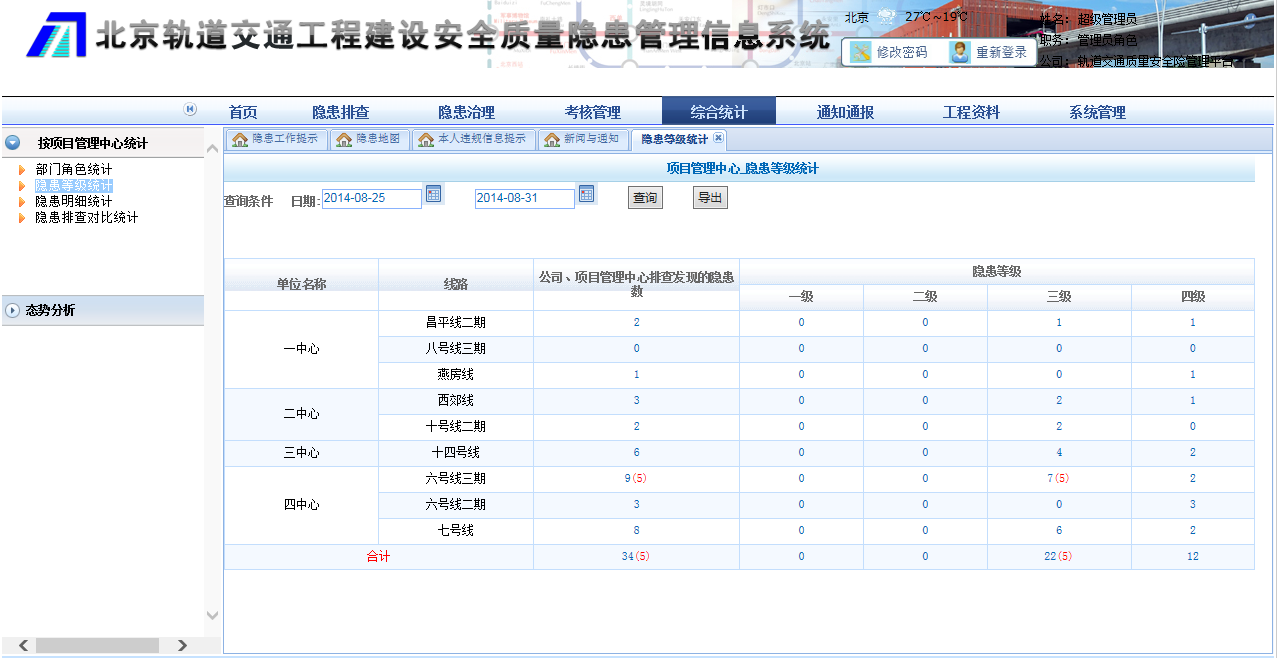 4、完成“北京軌道交通工程建設(shè)安全質(zhì)量隱患管理系統(tǒng)”的需求調(diào)研、升級(jí)研發(fā)與測(cè)試、使用培訓(xùn)與數(shù)據(jù)初始化工作;