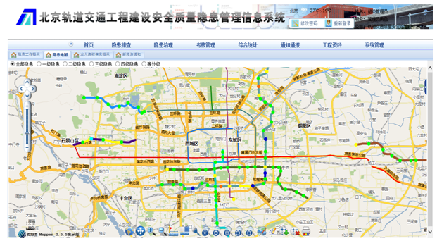 北京市軌道交通建設(shè)管理有限公司于2011年2月提出開(kāi)展安全質(zhì)量隱患排查與治理研究與信息系統(tǒng)研發(fā)的指示;2012年3月~12月六號(hào)線一期工程隱患排查與治理試運(yùn)行;2013年6月軌道公司總經(jīng)理辦公會(huì)與董事會(huì)會(huì)議確定推進(jìn)隱患系統(tǒng)應(yīng)用,開(kāi)展試點(diǎn);2013年10月~12月在建6條線路53個(gè)標(biāo)段試點(diǎn)應(yīng)用; 2014年3月系統(tǒng)升級(jí)研發(fā)需求報(bào)告研討與完善與定稿;2014年7月~9月新版系統(tǒng)上線,在建9條線路81個(gè)標(biāo)段211個(gè)工點(diǎn)的全線應(yīng)用。