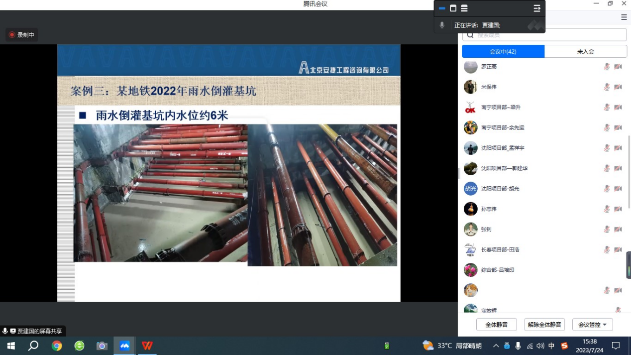接著北京項目部賈建國和合肥項目部魏兵超做了遠程匯報,主要圍繞“汛期安全管控相關法規(guī)政策”、“汛期施工風險機理及管控措施”、“汛期安全風險管控案例”、“北京、合肥項目部管轄路線汛期工作特點”、“北京、合肥汛期安全措施及典型現(xiàn)場汛期安全巡視視頻展示 ”等方面展開。